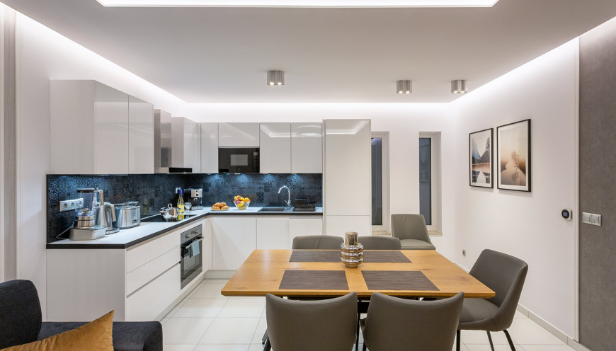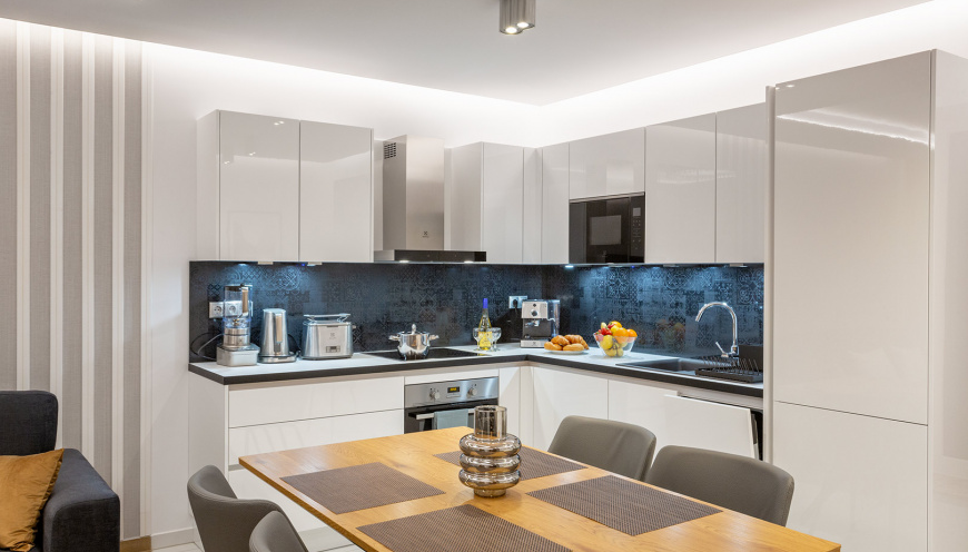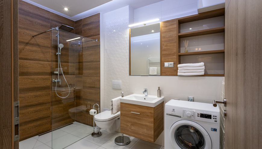 Két hálószobája és tágas nappalija révén akár 6 fő is kényelmesen elfér. A konyha és a fürdőszoba a legmodernebb műszaki berendezésekkel lett felszerelve. Mosó- és mosogatógép, tűzhely, mikrohullámú sütő, kenyérpirító, turmix gép, kávé-/teafőző található az apartmanban. A nappaliban internetes síkképernyős TV, a lakásban ingyenes wifi áll rendelkezésre.