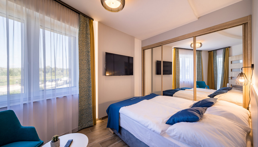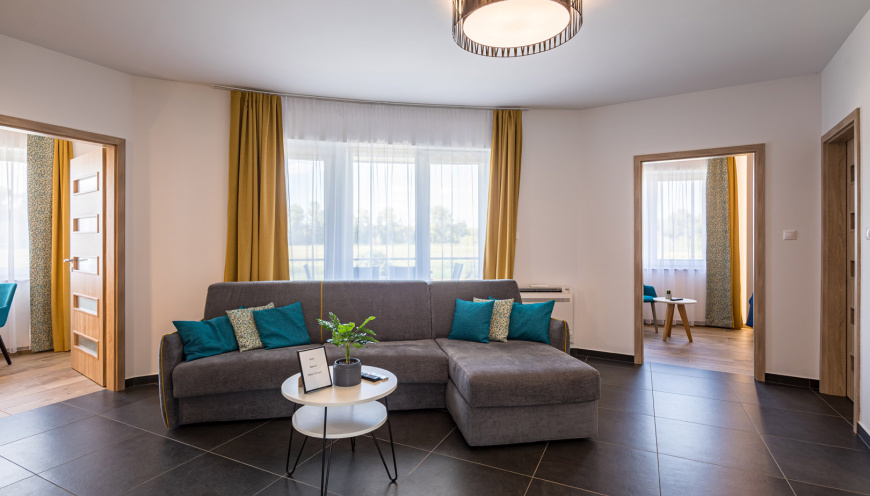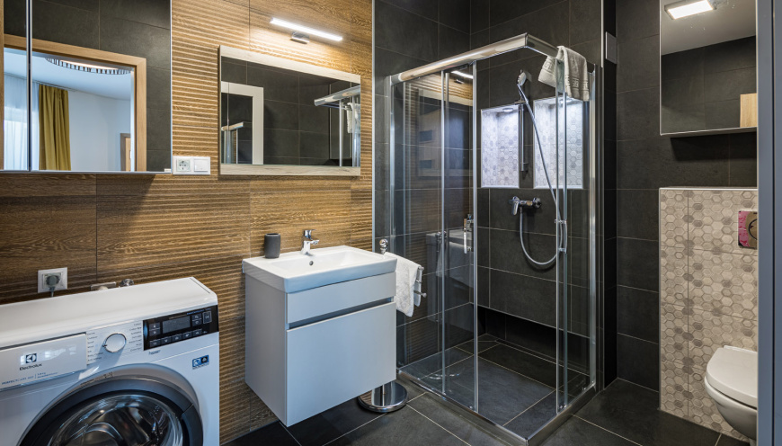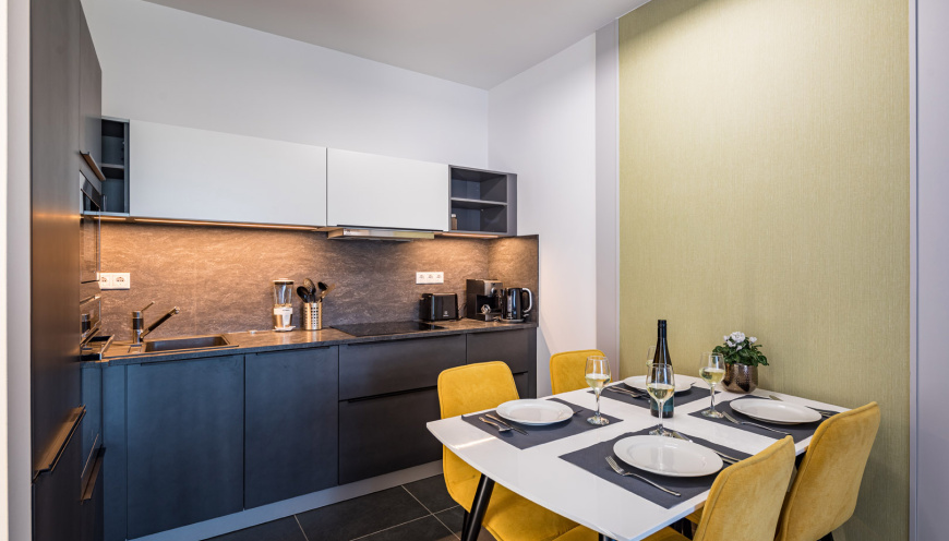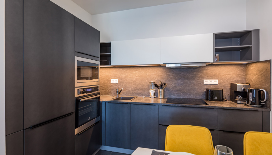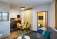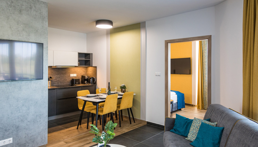 Két hálószobája és tágas nappalija révén akár 6 fő is kényelmesen elfér. A konyha és a fürdőszoba a legmodernebb műszaki berendezésekkel lett felszerelve. Mosó- és mosogatógép, tűzhely, mikrohullámú sütő, kenyérpirító, turmix gép, kávé-/teafőző található az apartmanban. A nappaliban internetes síkképernyős TV, a lakásban ingyenes wifi áll rendelkezésre.